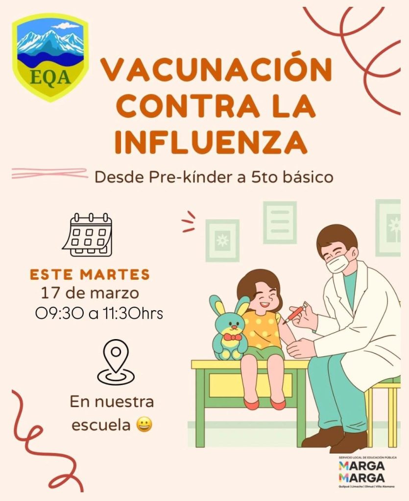 En nuestro establecimiento, la vacuna se realizará el día MARTES 17 DE MARZO, de PRE-KINDER A 5°AÑO BÁSICO en horario de 09:30 a 12:30.