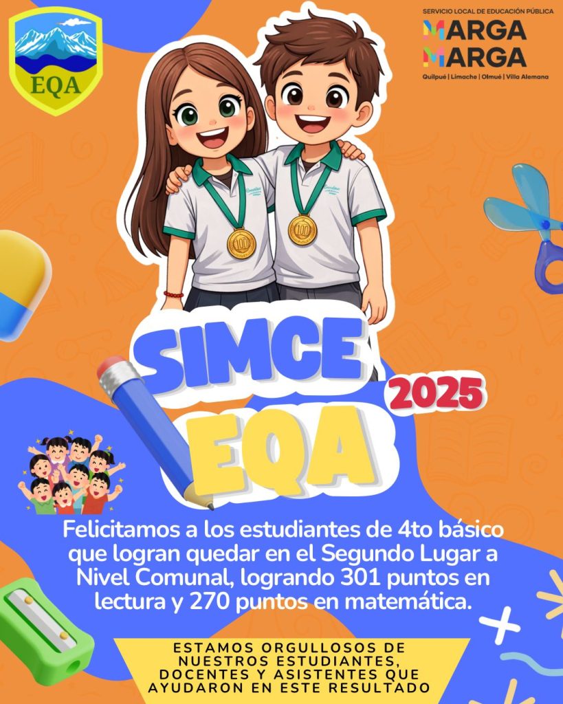 Tenemos el gran agrado de compartir una excelente noticia. Destacamos y felicitamos a los estudiantes de 4° básico 2025 por haber obtenido el segundo lugar a nivel comunal en el SIMCE 2025, logrando 301 puntos en Lenguaje y 270 puntos en Matemática.